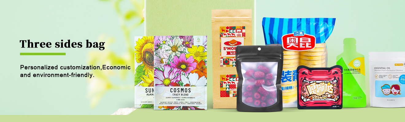 Three-side sealed bags are widely used in snack food packaging bags, facial mask packaging bags, etc. in daily life. The three-side seal pouch style is three sides sealed and one side open, which can be well hydrated and sealed, ideal for brands and retailers.